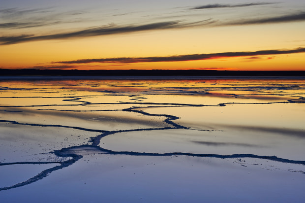 Salt crust forms beautiful patterns enhanced by water pools formed by a recent rain. Shot taken in Western Kazakhstan