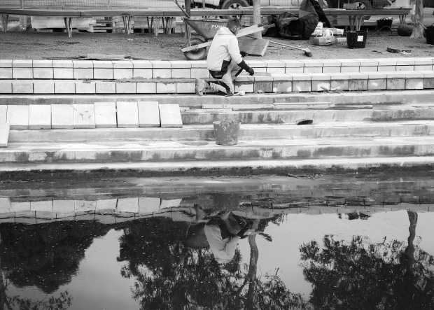 This photo is of a Stonemason who was installing paving stones around a new ornamental pool at Cranbourne Botaniclal Gardens, Victoria. I liked seeing his reflection in the pool around which he was working.