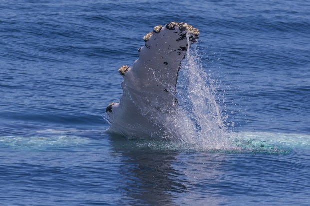 On a sunny morning on board a whale watch boat two large whales came over to check us out. The water was glassy and the stunning aqua-white colours of the whales under water was amazing! This whale lifted up its pectal fin and slapped it onto the water a number of times and the droplets of water looks like shattered glass. A very special moment!