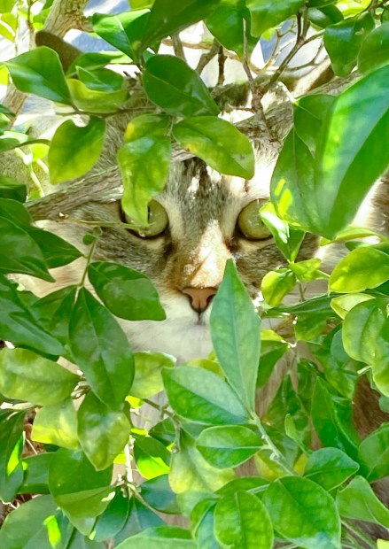 Maya thinks she cannot be seen hiding behind the camouflage.