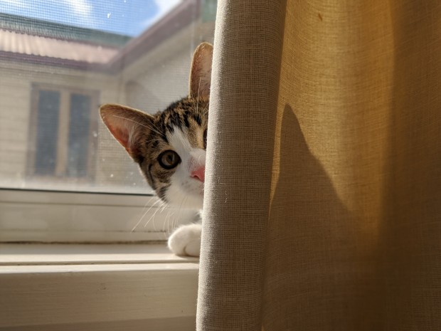 This image shows a playful cat peeking out from behind a curtain. His shadow can not only be seen on the curtain in front of him, but also on the window behind him.