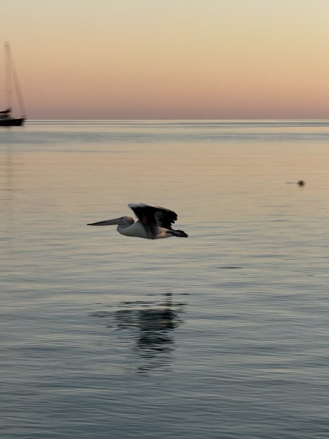 A pelican in flight at the most beautiful hour of the day. Shot at Monkey Mia, WA