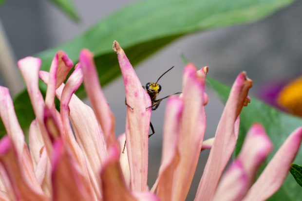 A mid summer afternoon sees a small wasp peeking around the soft pink petals of a zinnia flower, it's faced dusted by golden pollen.