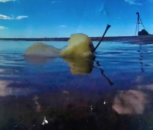I had taken this interesting photograph at Thirroul beach NSW Australia . A timelapse was being performed with another camera in the background. I took this photograph with a film camera. A pear I was eating . Interesting angle. And taking a postmodern approach taking a photo of a camerataking a photo then taking a photo of the photo.