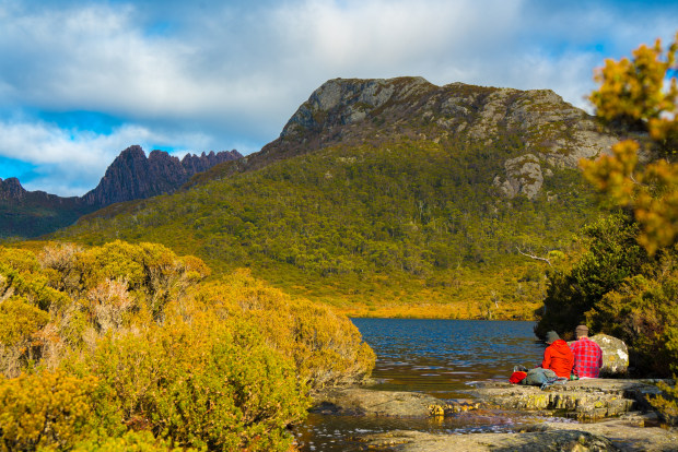 While hiking Cradle Mountain in Tasmania, I came across a brilliant scene of two people enjoying a break nestled together by the water, gazing at Cradle Mountain as they ate.