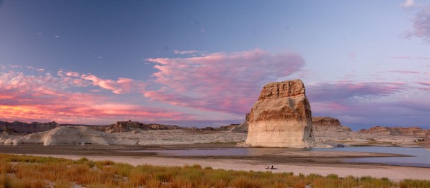 A lone couple enjoyed a picnic on the beach as the sun set over Lone Rock in Lake Powell