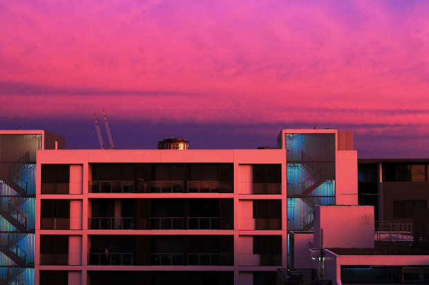This was one of the most spectacular & peculiar sunrises I've ever witnessed. I woke to see a pink light breaking through my hotel window. I quickly rushed outside onto the balcony with my camera. I'd left my tripod inside but in the moment (also conscious that I could miss its peak) I precariously rested my camera on the balconies edge and took this shot. The sunrise gave the building an ominous pink glow and the blue lights from the stairwell provided contrast to the scene.