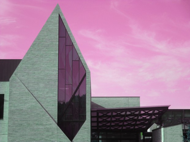 Grey buildings and pink sky