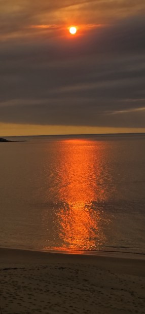 Pink sun resting on the waters.