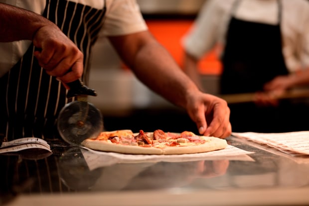 A chef using a pizza cutter