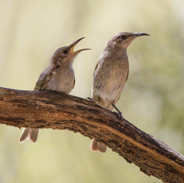 It looks as though this parent Brown Honeyeater is about to tell its constantly squawking offspring to go out into the world and fend for itself.