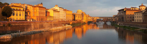A golden dawn lights up the Ponte Vecchio and waterfront buildings in Florence, Italy.