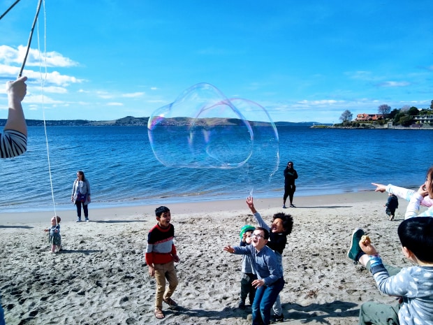 Pure, simple joy on the faces of children delighting in the spectacle of giant bubbles at Long Beach, Tasmania