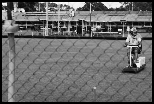 A retired man volunteers his time at the local lawn bowls club. Taking pride in ensuring the greens are prepared for the days match.