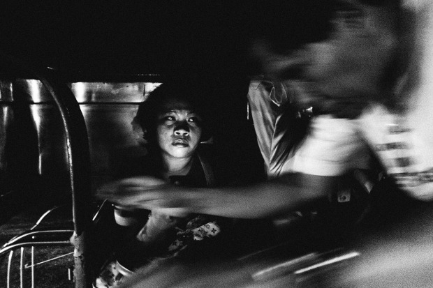 This shot was taken during night, inside a jeepney. A jeepney is one of the Philippines' common mode of transportations. The photo shows a woman passenger reacting to a man alighting the jeepney. Her face bathed by the light coming from the screen of her mobile phone.