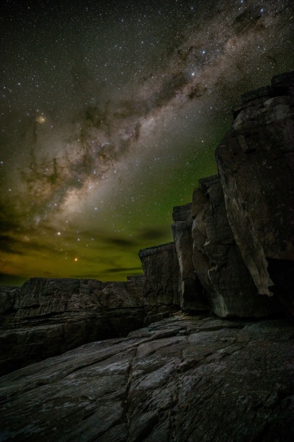 Pulpit Rock in Ben Boyd National Park, together with airglow. Foreground 600s f2.4 ISO 800, sky 120s f2.8 ISO 800.