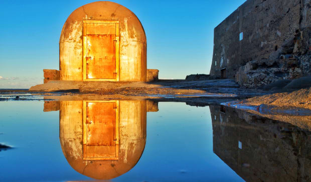 A gorgeous golden sunset and near perfect reflection of an ocean bath pumphouse.
