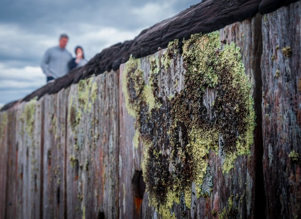 Close-up of a pier as 2 pedestrians walk by