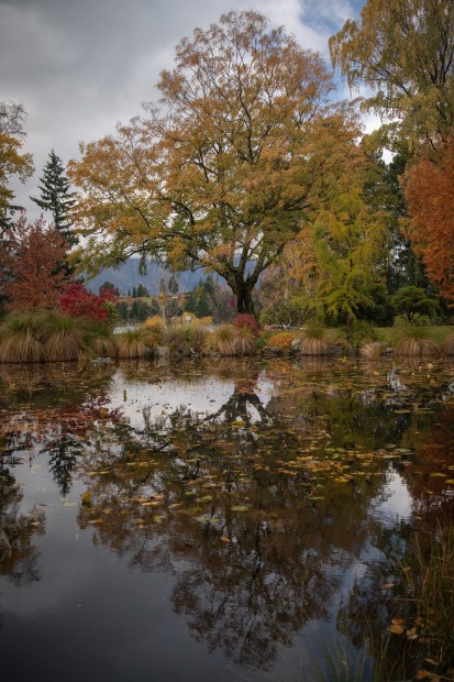 This image highlights the gorgeous autumn colours in the Queenstown Botanical Gardens. The yellow leaves on the large tree are captured in the reflection on the lake.