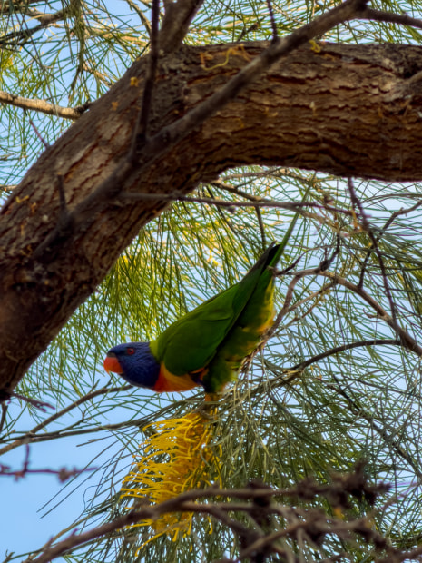A rainbow lorikeet pauses mid-flight in the branches, showcasing the vivid palette of colours that make it one of Australia’s most iconic birds.
