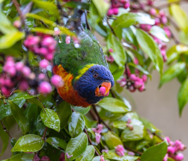 Rainbow Lorikeets enjoying the fruit off the Lilly Pilly tree on a wet day