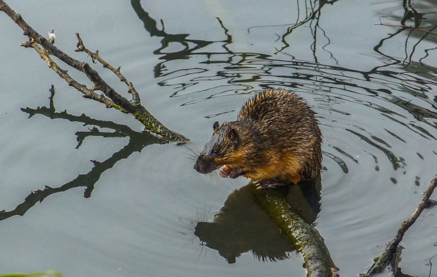 A rakali having a short rest on a branch submerged in a lagoon.