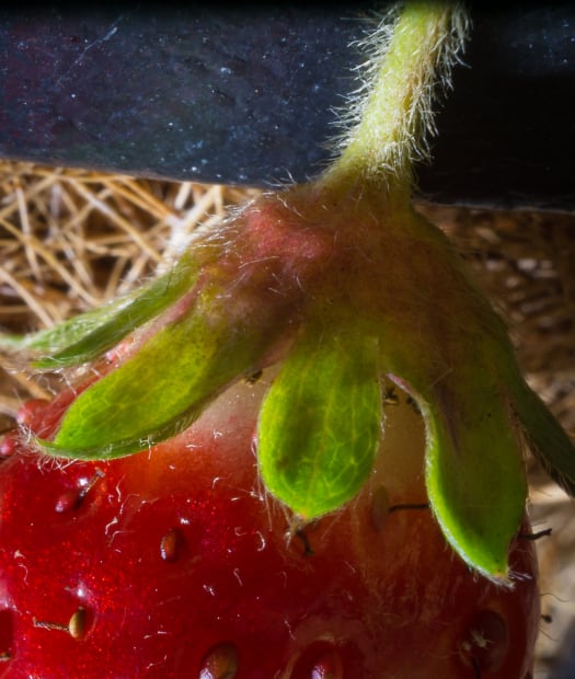 A close up of a strawberry stem and fruit.