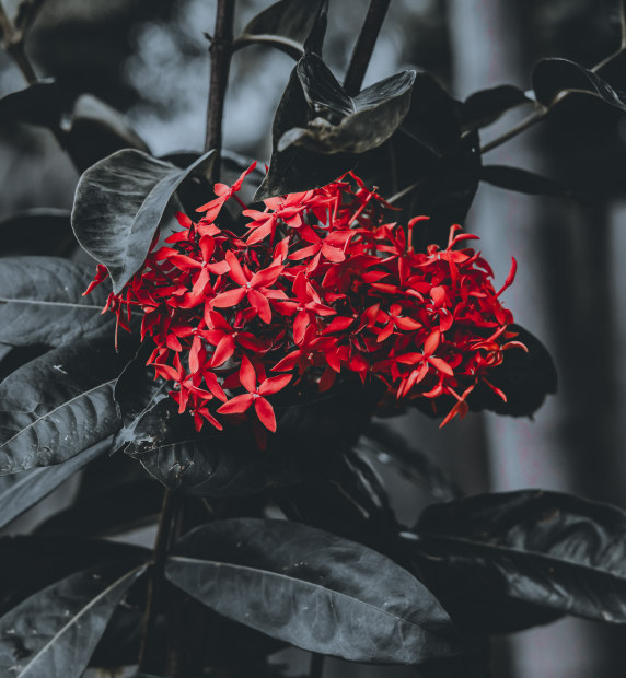 The bold red flowers stand out beautifully against the moody, desaturated leaves, giving the image a dramatic and poetic feel.
