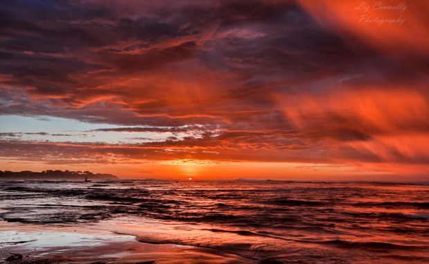 Red sunrise on a stormy wet morning at Torquay Victoria.
