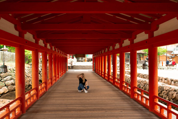 A photo from a temple on Miyajima island, Japan filled with rows of red pillars.