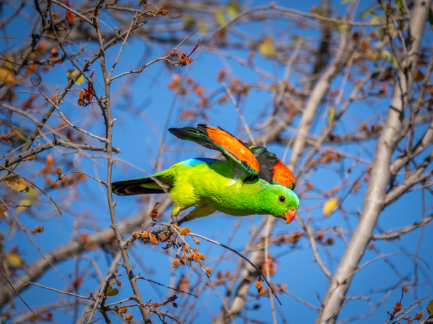 On a trip to WA I took this shot of a red winged parrot just about to launch from a tree