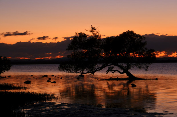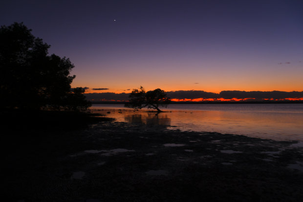 Sunrise at Redland bay mangroves ,light touching the trees as tide comes in