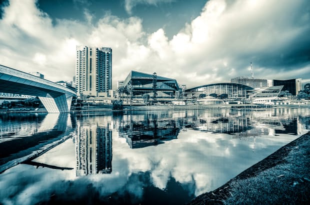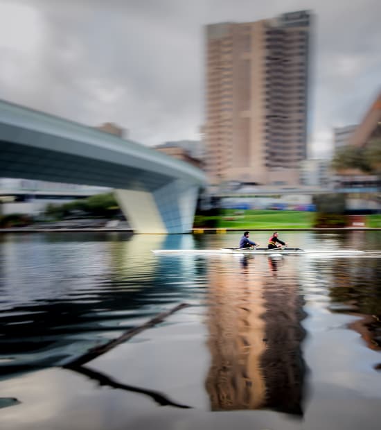 Morning light over the River Torrens, Adelaide South Australia castes a wonderful colour caught doubly by the still water reflection of the city