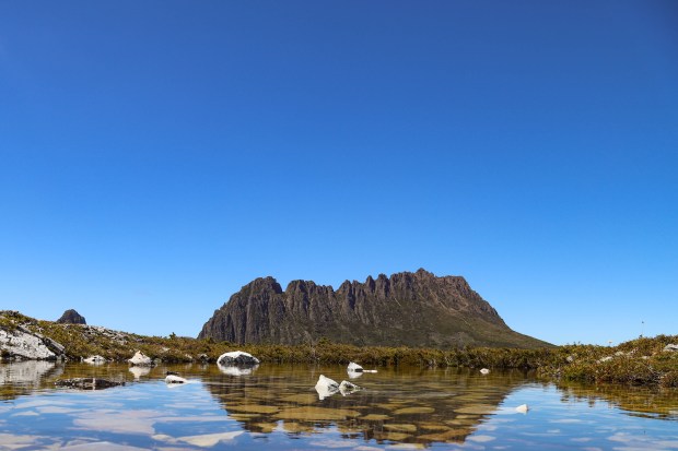 Water reflects an isolated mountain