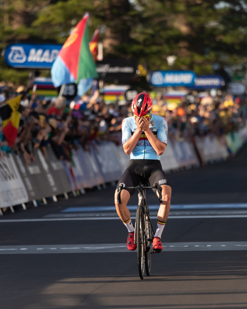 That moment when you realize that you've just become World Champion! Remco Evenepoel in Wollongong at the UCI Road World Championships 2022.