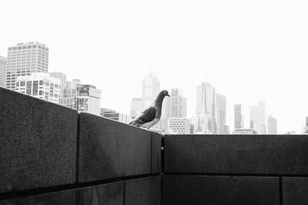 a pigeon, reuben, (named so because) sits on a dark brick wall with a bright city backdrop