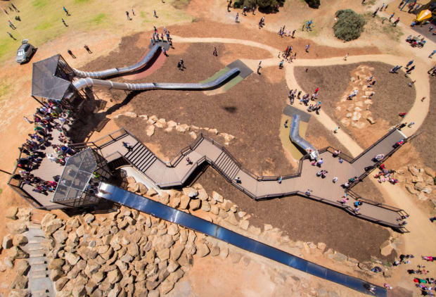 St. Kilda playground, South Australia. Aerial view of the very busy slides at the adventure playground, located on the coast. Kite Aerial Photography, Taken by a Canon 100 D with 10-22mm lens, suspended from a large 2.7m Delta Conyne kite.