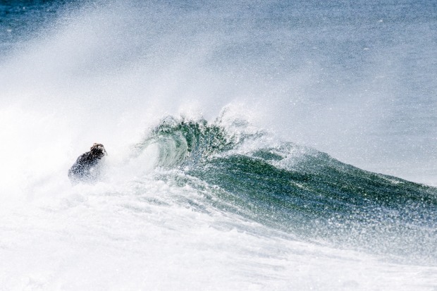 A big sea being blown into submission by a strong North Westerly today as this board rider held to his ride turning to face the wave in defiance.