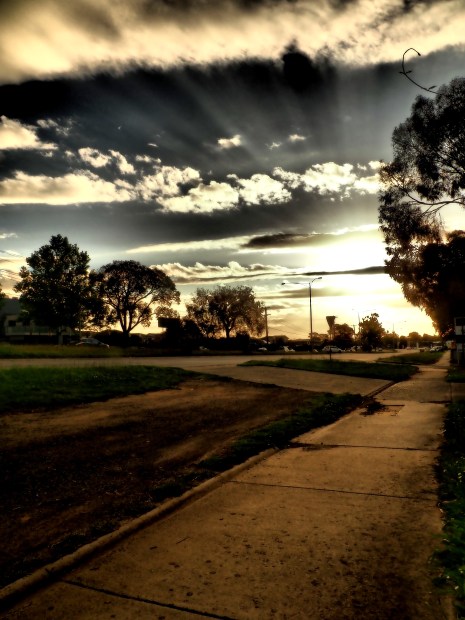 I adore the rays of white coming from the clouds, the dirt on the side of the road gives surban an outback feel