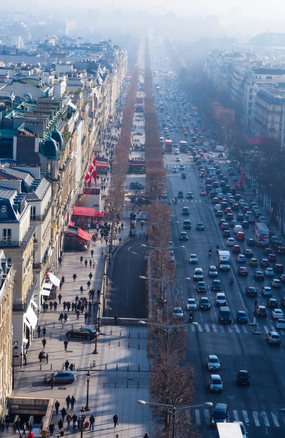 A winters morning in Paris , taken from the top of the Arch de Triomphe , with the road disappears into the distance