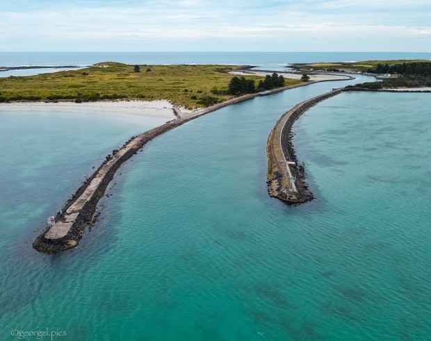 The iconic bluestone walls at the Moyne River entrance in Port Fairy, were built to allow boats to access the wharf.