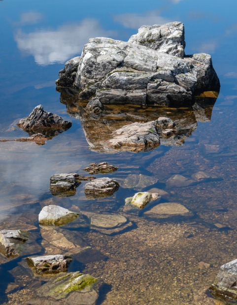 It was a beautiful day at Dove Lake in Cradle Mountain and the blue sky and clouds were reflecting in the lake. I was drawn to this rock pile for how they stood out from the water and also threw their own reflections in the water