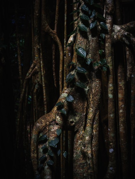 A dense network of fig tree roots, anchoring into the earth as a creeping vine winds its way through the tangled mass—nature’s quiet display of trees and plants