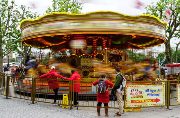 Slow shutter speed gives movement to the moving parts of the carousel but keeps the stationary parts of the picture sharp.
