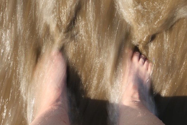 A wave rushing back into the ocean, around my feet, at Seven Mile Beach in NSW.