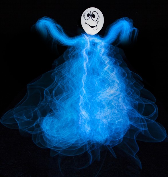 A speedlight behind a white balloon with face + EL lights = ghost of course!