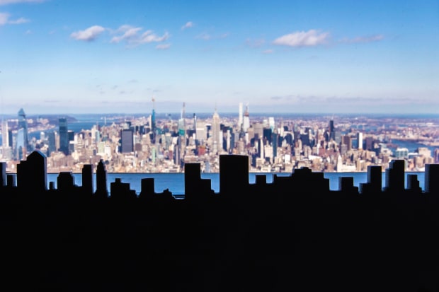 An outline of the NYC skyline located in the One World Observatory mirrors the buildings in the distance.