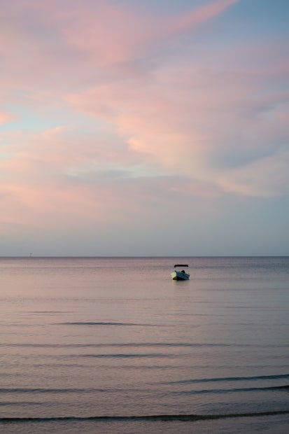 A single boat anchored for the night under a calm pastel sunset.