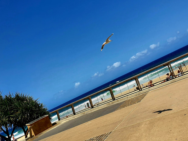 Where the blue skies mirror the ocean shores,with a seagull capturing a moment in time.