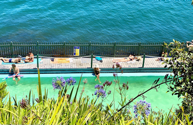 Blue harbour and blue pool at Cremorne McCallum pool. People enjoying the summer lounge in between